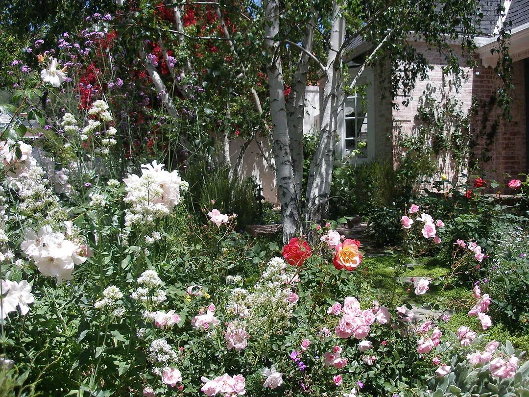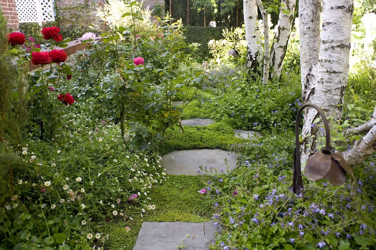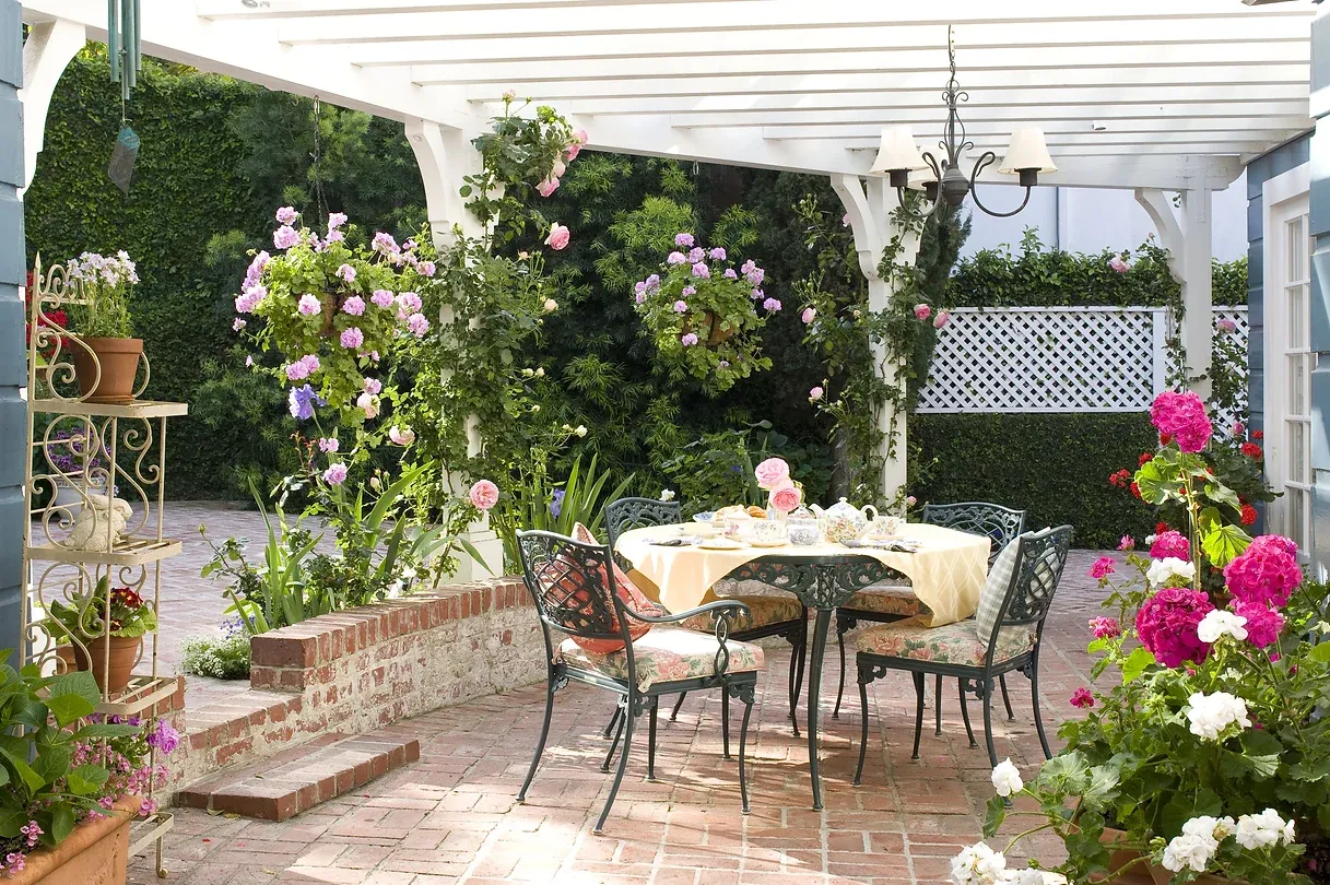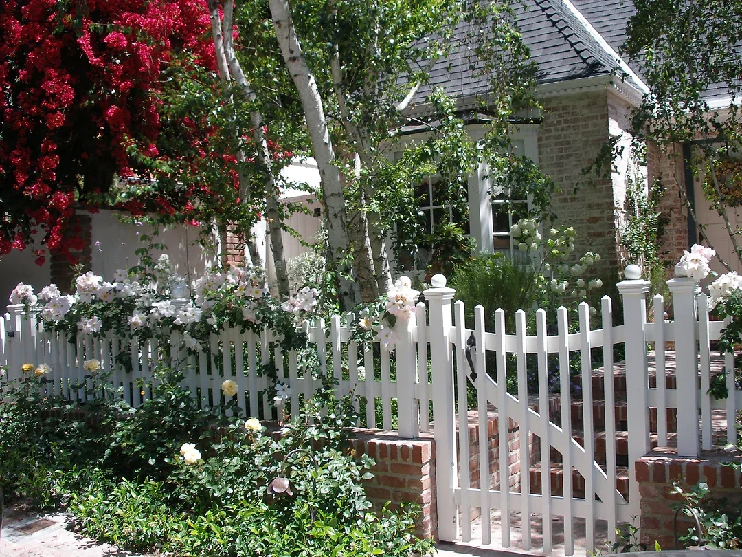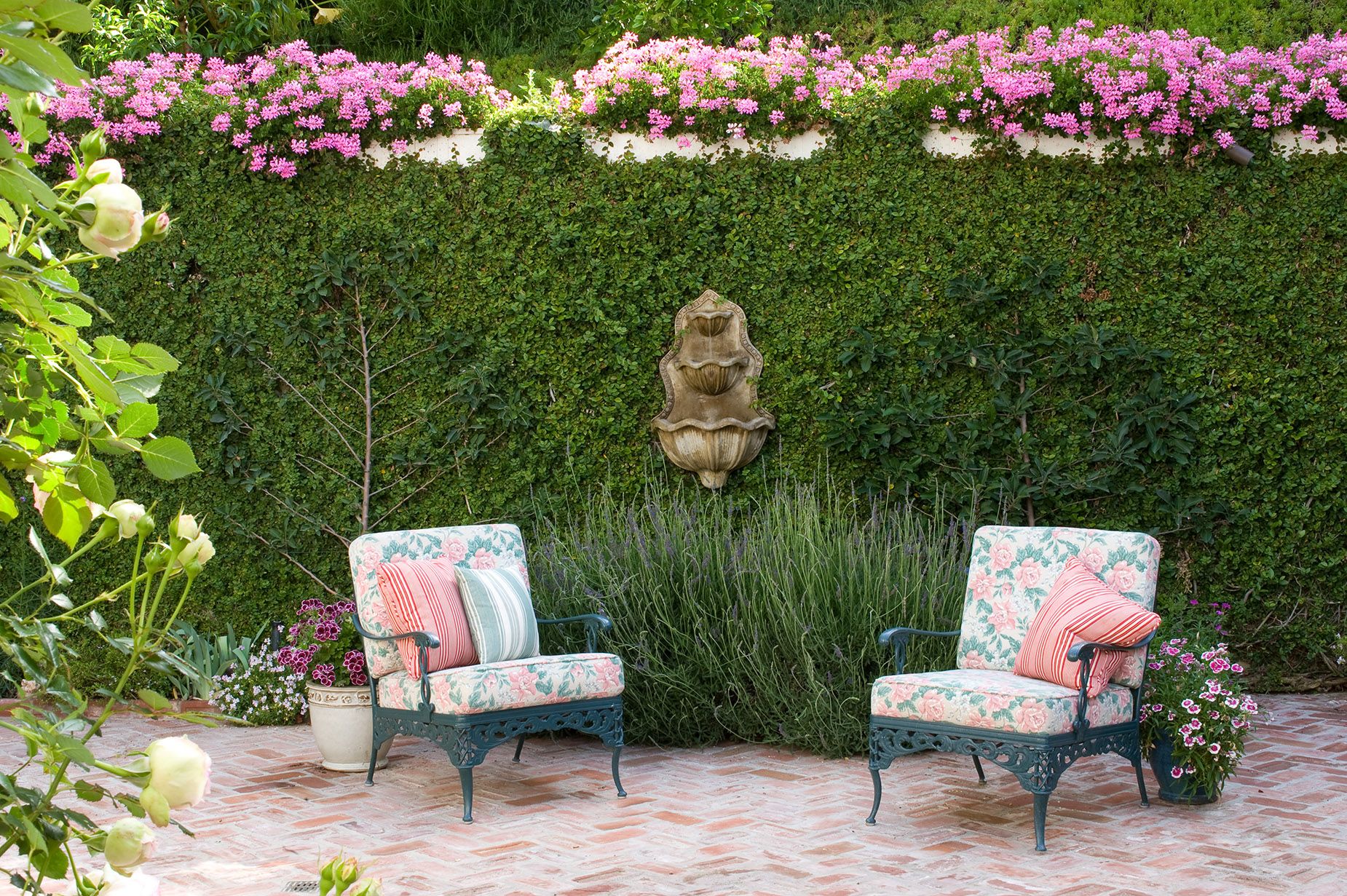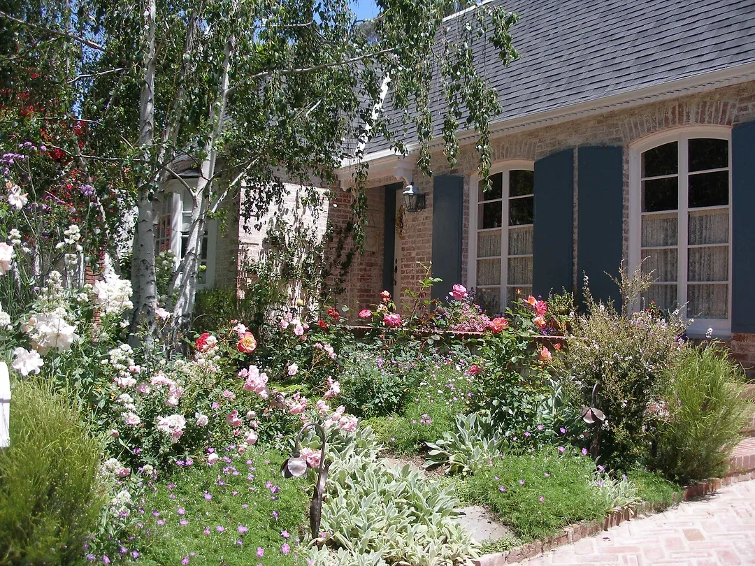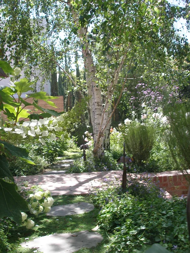 Modern and romantic garden with greenery and flowers in Beverly Hills